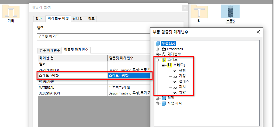 부품 템플릿 매개변수에서 사용 가능한 패밀리 템플릿 스레드 방향으로 매핑합니다.
