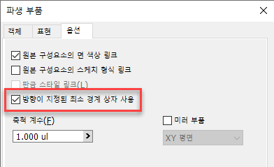 또한 파생 부품에서 선택한 구성요소를 직교 경계 상자로 나타내는 것도 부품에 사용할 수 있습니다. 파생 부품 및 부품 만들기 대화상자에 옵션이 추가되며, 하나의 본체 또는 전체 솔리드 본체 폴더만 설정할 수 있습니다.
