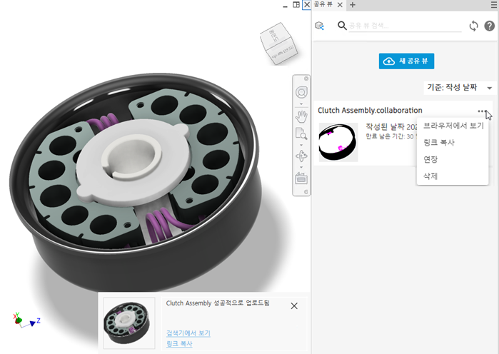 Fusion 360 내보내기에 사용된 Inventor 모형 상태 또는 설계 뷰에서 변경이 발생한 경우 내보내기 상황에 맞는 메뉴에서 Fusion 360에서 열기를 클릭하면 Inventor 모형 및 Fusion 360 모형이 동기화되지 않았으므로 열기 전에 Fusion 360 모형을 업데이트하는 옵션이 제공된다는 알림이 표시됩니다.