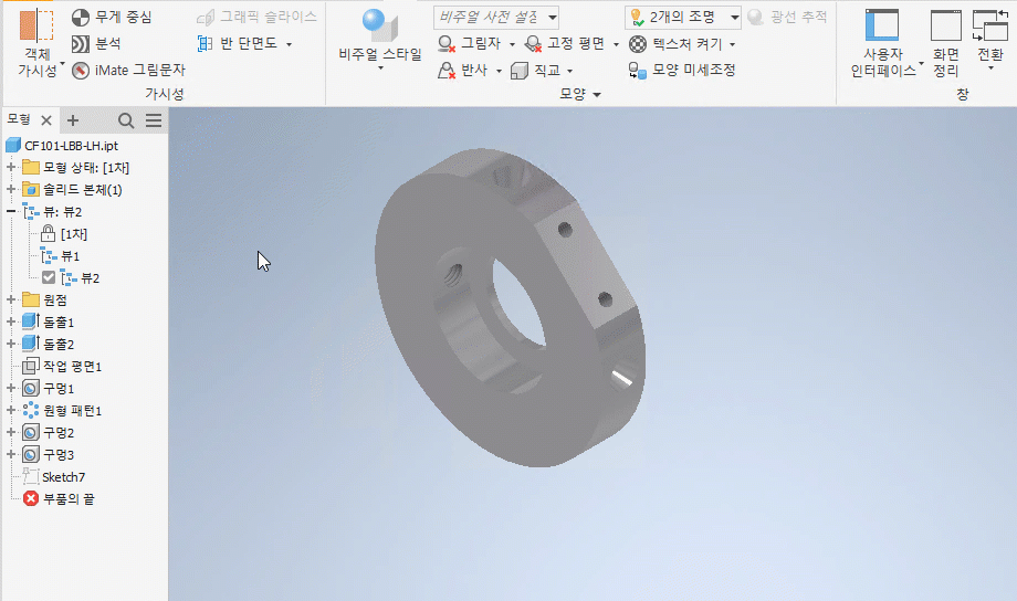끝막음 가시성은 부품 개수가 500개 이하인 경우 단면화된 형상의 끝막음을 표시하도록 기본적으로 설정됩니다. 부품 개수가 500개를 초과하면 끝막음이 표시되지 않습니다. 미니 도구막대에서 옵션을 선택하거나 선택취소하여 설정을 재지정할 수 있습니다.