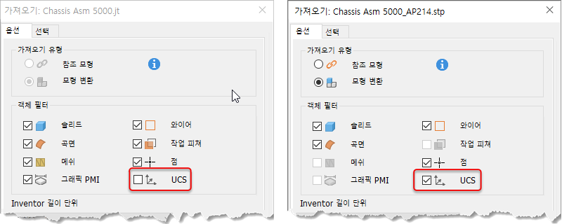 JT와 STEP은 가져올 때 UCS를 포함하는 옵션을 지원합니다.
