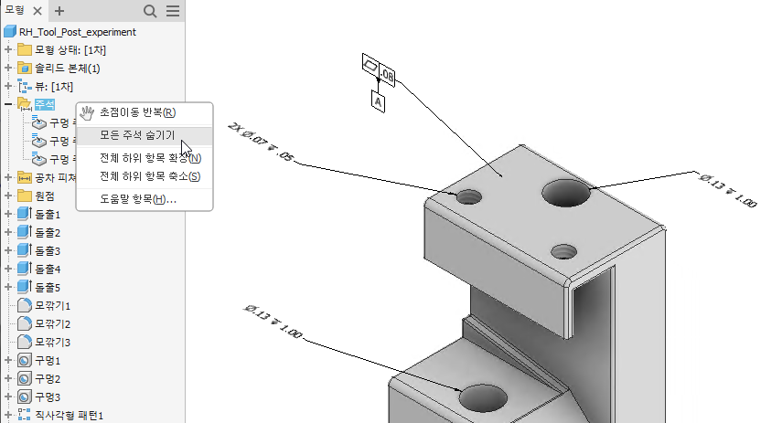 모든 3D 주석은 모형 검색기의 폴더에 배치됩니다. 모든 3D 주석은 폴더 상황에 맞는 메뉴의 모든 주석 숨기기를 통해 숨길 수 있습니다.