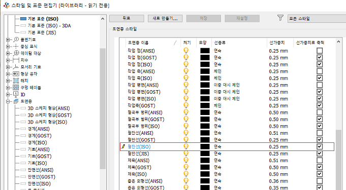 또한 ISO 표준의 "브레이크 아웃 선" 객체 유형이 변경되었습니다. 지금까지는 "두께"의 "가시적" 도면층이 0.5mm로 설정되었습니다. 이제 업데이트된 표준에 따라 "브레이크 아웃 선" 객체 유형이 두께가 0.25mm인 "끊기 선" 도면층에 설정됩니다. 이는 DIN/GB/JIS 표준에도 적용됩니다.