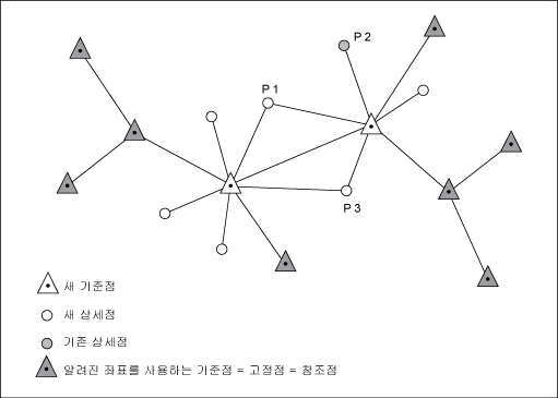 기존 상세점—데이터베이스에 저장된 상세점. 조정 계산을 시작하기 전에 경우에 따라 기존 상세점을 검색할 수 있습니다. 예를 들어 좌표를 개선하거나 좌표의 유효성을 확인하기 위해 상세점을 한 번 더 측정하여 기존 점을 조정 프로세스에 추가할 경우입니다.