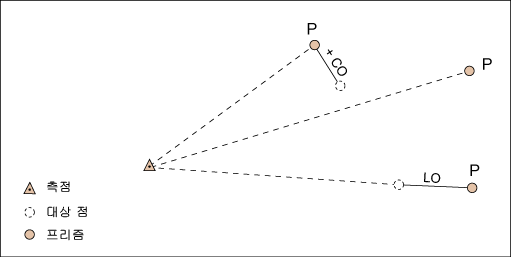 타키미터 측정에서는 대상점을 바로 측정할 수 없는 경우 길이 간격띄우기 및 교차 간격띄우기가 사용됩니다.