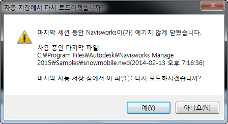 파일에 변경 사항을 저장하기 전에 Navisworks가 닫히는 경우 마지막으로 작업 중인 파일을 자동으로 다시 로드하거나 백업 파일을 수동으로 로드할 수 있습니다.