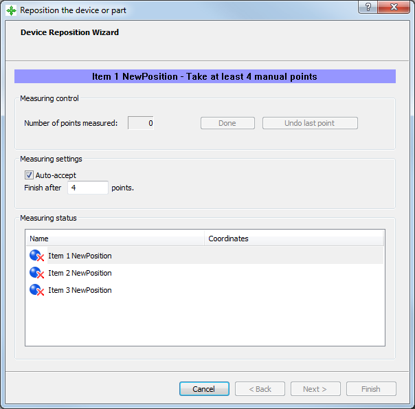 부품 또는 장치를 재배치할 때 PowerInspect는 이동 전에 측정한 값과 이동 후에 측정한 값을 일치시키고, 이러한 측정값을 사용하여 축변환을 생성합니다. 이 축변환은 위치 변경 후에 수행되는 모든 측정값에 자동으로 적용되며, 원래 좌표계에서 측정을 계속할 수 있습니다.