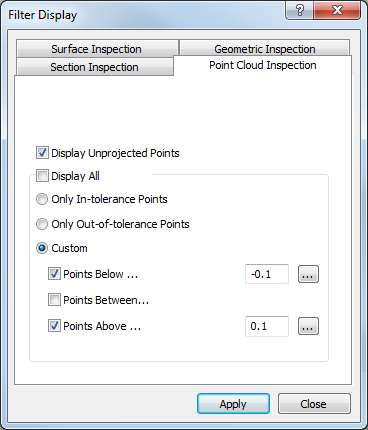 CAD 뷰에서 측정된 점군 데이터 포인트에 대한 표시를 필터링하려면 보기 탭 > 뷰 옵션 패널 > 필터 디스플레이를 클릭하고 점군 데이터 측정 탭을 선택합니다.