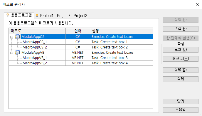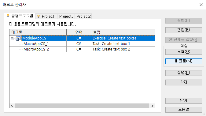 매크로 관리자를 사용하여 매크로를 관리하고 실행할 수 있습니다.