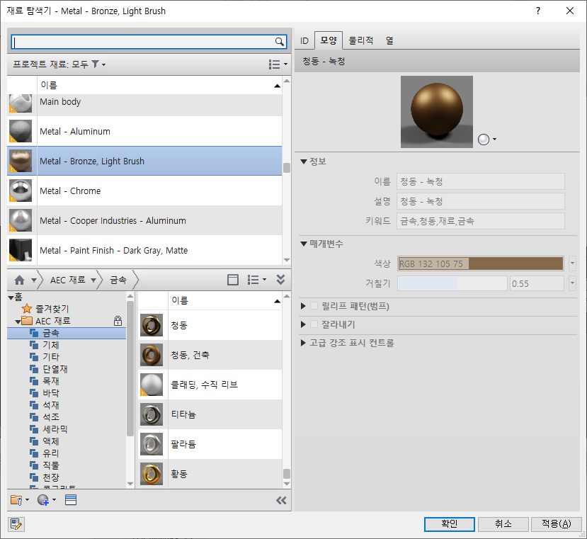 재료 탐색기 대화상자를 사용하여 요소에 대한 재료를 찾고 관리할 수 있습니다.