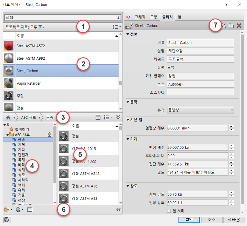 | 5 | 라이브러리 재료 리스트: 라이브러리 리스트에서 선택된 라이브러리 또는 카테고리(클래스)의 재료를 표시합니다. |