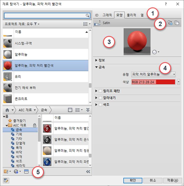 | 4 | 특성 패널: 선택한 렌더링 모양 맵소스의 세부 특성을 표시 및 관리합니다. 에셋 이름 및 설명은 정보 드롭다운 패널 아래에 표시됩니다. 위의 이 예에서는 "피막 처리 - 빨강" 모양 렌더링 모양 맵소스에 대해 표시(확장)되는 금속 특성을 보여줍니다. 예를 들면, 액체에 대해 표시된 특성 세트는 금속에 대해 표시된 특성 세트와 다릅니다. |