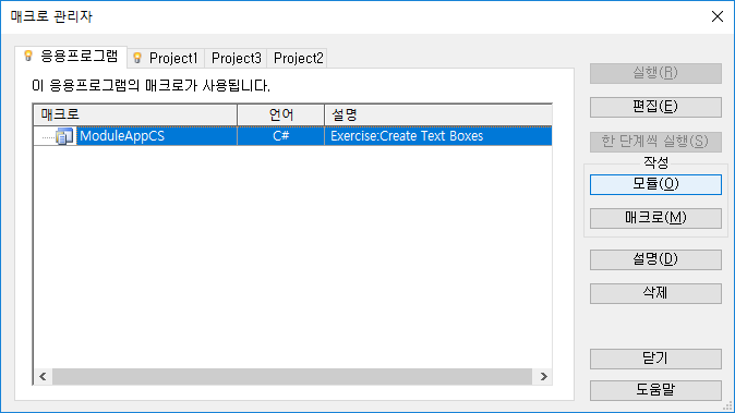 - 응용프로그램 레벨 매크로의 경우 응용프로그램 탭을, 문서 레벨 매크로의 경우 프로젝트 탭을 선택합니다.