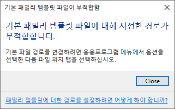 주의: 필수 컨텐츠 팩을 제거하면 Revit.ini에 지정된 패밀리 템플릿 경로에서 패밀리 템플릿을 찾을 수 없기 때문에 Revit에 다음 메시지가 표시될 수 있습니다.