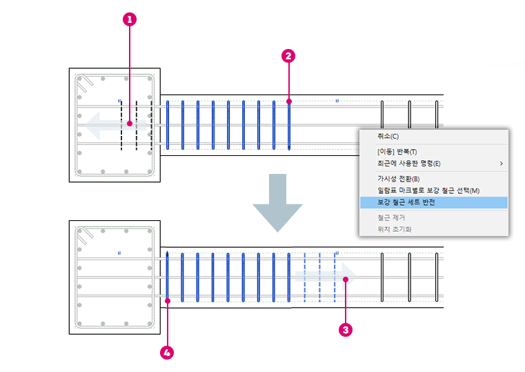 - 고정 개수: 보강 철근 간 간격은 조정할 수 있지만 철근 수는 사용자의 입력에 따라 그대로 유지됩니다.
