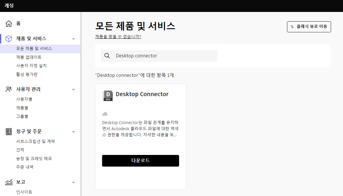 최신 버전을 다운로드하려면 Autodesk Account 제품 및 서비스로 이동하십시오. Desktop Connector가 제품 및 서비스 아래에 나타납니다.
