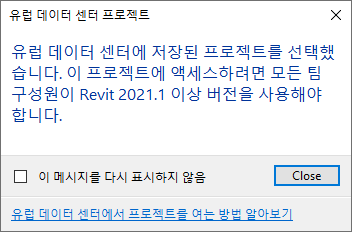 유럽 데이터 센터에 저장된 P&ID 모델러에서 Revit 2021.1 모델에 액세스할 때 경고가 수신되면 다음 정보를 검토하십시오.