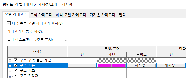 대부분의 가시성 및 그래픽 화면표시 재지정은 가시성/그래픽 대화상자에서 이루어집니다. 예외적으로 개별 요소 재지정은 뷰 특정 요소 그래픽 대화상자에서 수행됩니다.