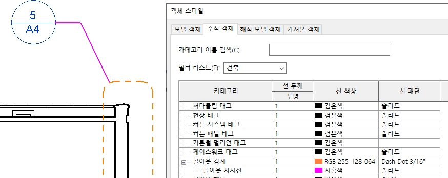- 선 두께, 선 색상 및 선 패턴 열을 사용하여 콜아웃 경계, 콜아웃 지시선 및 콜아웃 헤드에 대해 원하는 설정을 지정합니다.
