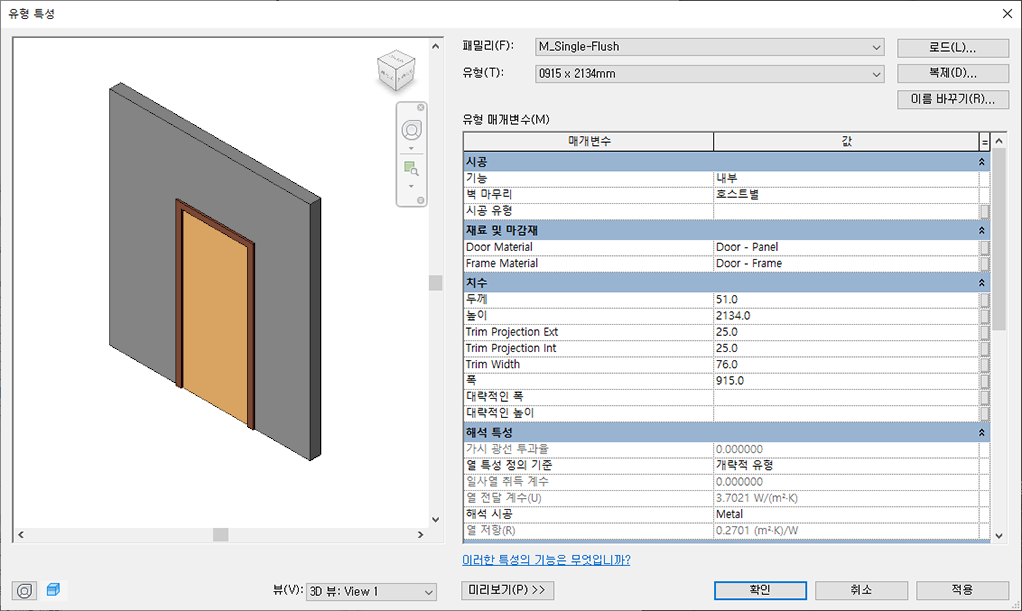 유형 특성 대화상자는 패밀리 유형 이미지를 표시하는 미리보기 창을 제공합니다.