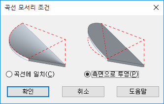 곡선 모서리 조건 도구는 곡선 모서리와 관련된 추가 도구입니다. 이 도구는 요소의 호 모서리에 일치하는 모서리나 곡선 표면에 평평한 표면을 투영하도록 곡선 모서리를 설정합니다.