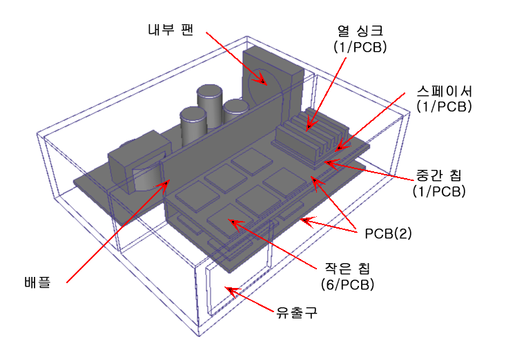 이 튜토리얼에서는 전자 엔클로저 내의 흐름 및 열 전달을 시뮬레이션합니다. 이 시스템에는 여러 구성요소가 포함되어 있으며 이러한 구성요소를 압축 열 모형, 내부 팬 및 분산 저항(통기성 매체)과 같은 Autodesk® CFD 재질 장치 모형을 사용하여 모델링합니다.