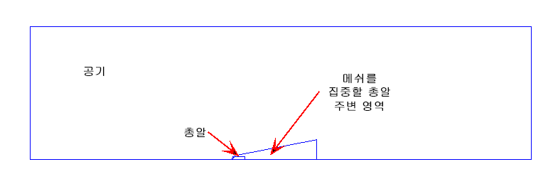 고속 외부 흐름에 권장되는 기술을 사용하여 총알을 큰 공기 볼륨 내에 완전히 포함시킵니다. 하위 영역이 총알을 둘러쌓여 예상 충격 영역 및 후류의 메쉬에 집중하도록 합니다.