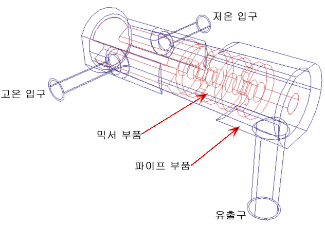 이 자습서에서는 단순화된 가정용 수도꼭지를 이동하는 물 흐름을 연구합니다. 뜨거운 물과 찬 물이 수도꼭지로 유입되고 혼합 영역에서 섞인 후 출구를 통해 나옵니다.