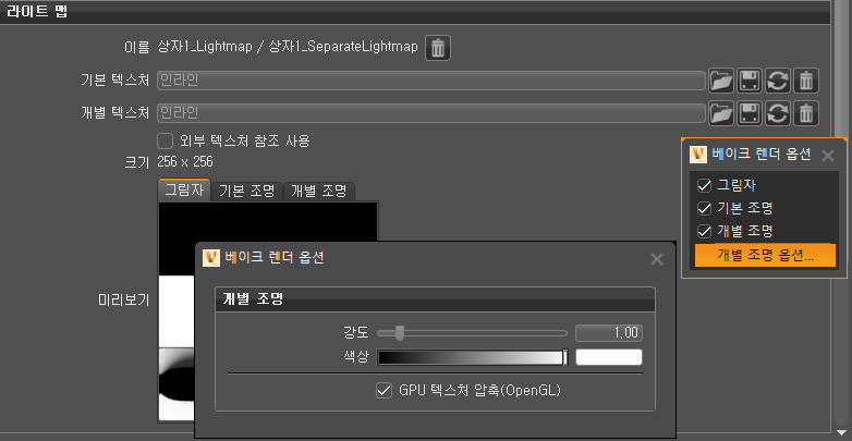 실시간 장면의 품질과 유연성을 높이기 위해 별도의 조명 텍스처 채널을 베이크하는 새로운 옵션이 추가되었습니다. 이 옵션을 사용하면 환경과 별도로 자동차 내부에서 앰비언트 라이트를 베이크할 수 있습니다. 이제 이 장면에서처럼 베이킹에 독립적으로 환경을 전환할 수 있습니다. 베이킹 도구에서 개별 조명을 활성화하고 별도로 계산해야 하는 라이트와 별도 계산에 추가해야 하는 조명 재질을 정의해야 합니다. 이제 개별 조명 채널을 생성할 수 있습니다. 이 채널은 사전 계산된 조명 가시화에서 관찰할 수 있으며 새로운 베이크 렌더 옵션을 사용하여 표시할 채널을 제어할 수 있습니다. 또한 개별 조명에 강도 컨트롤을 추가했기 때문에 베이크된 개별 라이트의 강도를 제어하고 필요에 따라 색상도 변경할 수 있습니다. Python 스크립트를 사용하여 이 옵션을 제어할 수 있으며 라이트 페이드도 가능하므로 개별 조명 채널을 켤 때 매우 부드러운 전환이 가능합니다. 설치 시 함께 제공되는 예제를 참조하십시오.
