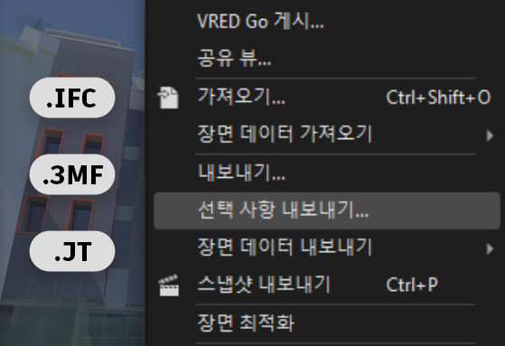두 번째 파일 유형은 IFC(Industry Foundation Class)입니다. 이는 건물 및 토목 인프라 데이터를 포함할 수 있는 산업 표준입니다. IFC는 건축 영역에서 사용되며 BIM 프로젝트와 같은 여러 팀의 교차 플랫폼 워크플로우를 위해 만들어졌습니다. 따라서 이제 IFC 형식을 통해 Revit 데이터를 VRED로 쉽게 가져올 수 있습니다. 이렇게 하면 Revit 파일을 FBX로 내보낼 때에 비해 훨씬 더 나은 결과를 얻을 수 있습니다. 또한 재질 및 메타데이터와 같은 추가 정보를 로드할 수 있습니다.