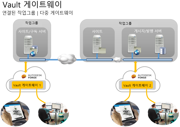 Vault 게이트웨이 기술은 클라우드 서비스를 통해 원격 장치를 Vault Server에 안전하게 연결합니다. Vault 게이트웨이 서비스는 Vault Client 소프트웨어(예: Vault Client, 애드인 등)에 로그인할 때 Vault Server 이름 대신 사용되는 URL을 생성합니다. 클라우드 서비스는 Vault Server와 접속하여 클라이언트와 서버 간에 실시간으로 데이터를 교환합니다.