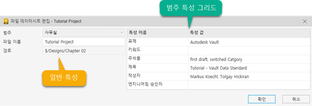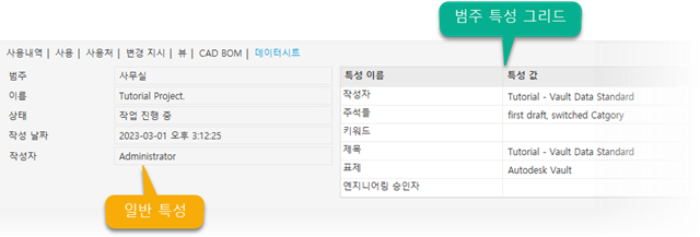일반 특성 그리드에는 대화상자 정의 파일에 저장된 Vault 특성에 바인딩된 정적 정의, 레이블 및 컨텐츠 컨트롤이 있습니다. 동적 그리드는 도면요소(파일, 폴더, 사용자 객체) 범주를 통해 자동으로 레이블 및 값 필드를 추가하는 빈 그리드 객체입니다. 이러한 두 그리드는 데이터시트 작성/편집(이전 이미지 참조) 및 상세 정보 탭의 데이터시트에서 핵심 요소입니다.