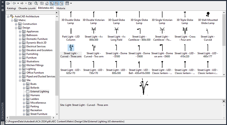 Do pakietów zawartości programów AutoCAD Architecture (w amerykańskich jednostkach imperialnych) i AutoCAD Architecture (w amerykańskich jednostkach metrycznych) do Design Center dodano ponad 200 nowych multibloków i odniesień do bloków. Dodana zawartość jest dostępna w profilu metrycznym w językach innych niż angielski. Zawartość obejmuje oświetlenie zewnętrzne, akcesoria łazienkowe, meble, teren, wyposażenie kuchni i inne elementy.