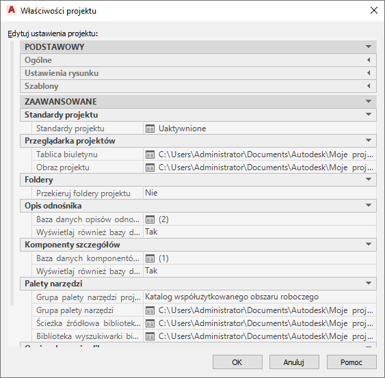Można zdefiniować lub zmienić zaawansowane właściwości projektu, takie jak standardy, obrazy, opisy odnośników, komponenty detali i palety narzędzi.