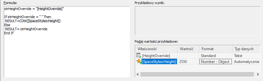 Wartości przykładowe są formatowane i wstawiane do formuły z nawiasami zamiast odpowiedniej nazwy definicji właściwości. Cała przykładowa formuła jest obliczana, a wynik jest wyświetlany w polu Przykładowy wynik.
