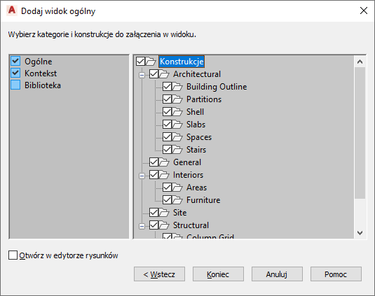 wybrać całą kategorię, aby dołączyć ją do rysunku widoku | wybierz kategorię. Wszystkie konstrukcje w kategorii wybierane są automatycznie. W przypadku dodawania konstrukcji do kategorii w późniejszym czasie zamieszczane są one w rysunku widoku. |