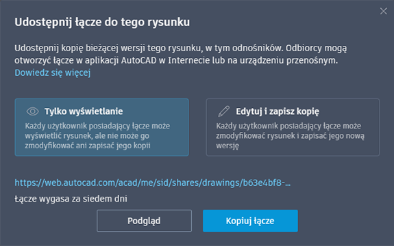 Każdy użytkownik dysponujący łączem może uzyskać dostęp do rysunku w przeglądarce internetowej lub w aplikacji mobilnej. Łącze wygasa siedem dni po jego utworzeniu. Można wybrać dwa poziomy uprawnień dla odbiorców: Tylko wyświetlanie i Edycja i zapisywanie kopii.