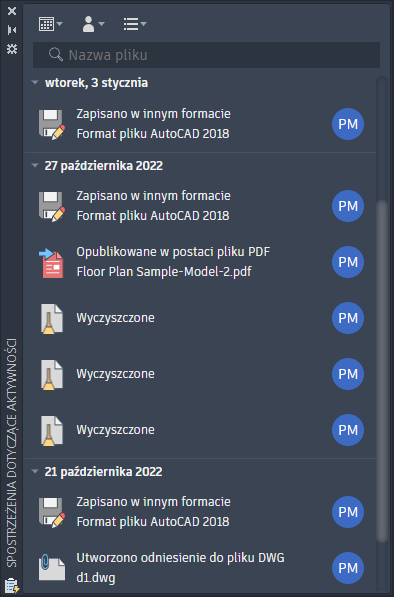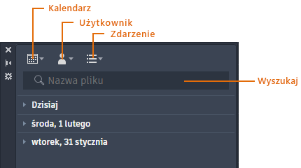 Umożliwia wyszukiwanie zdarzeń filtrów skojarzonych z bieżącym plikiem rysunku według ścieżki i nazwy pliku. Z funkcji wyszukiwania można korzystać samodzielnie lub w połączeniu z filtrem kalendarza, użytkownika i zdarzeń.