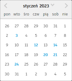 Niestandardowe — wyświetla znacznik wyboru dwóch lub więcej dat. Określone daty są wyróżnione na niebiesko.