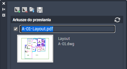 Domyślnie nazwa pliku PDF to <nazwa rysunku>-<nazwa układu>.PDF. Kliknij nazwę pliku, aby go edytować lokalnie.