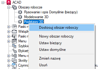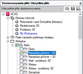 Na karcie Dostosuj, na panelu Dostosowywane pliki: <nazwa pliku> kliknij znak plusa (+) obok węzła Obszary robocze, aby go rozwinąć.
