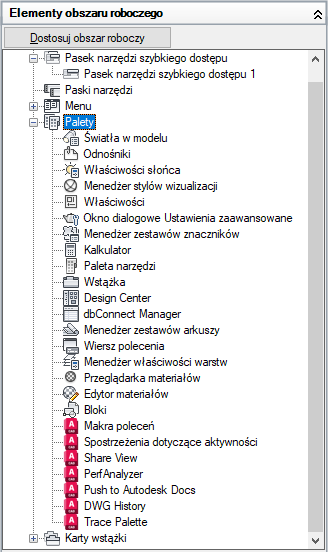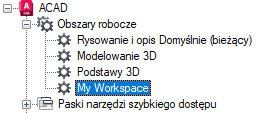 - Na karcie Dostosuj, na panelu Dostosowywane pliki: <nazwa pliku> kliknij znak plusa (+) obok węzła Obszary robocze, aby go rozwinąć.