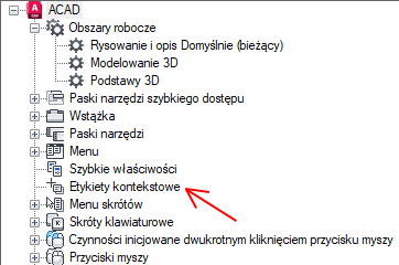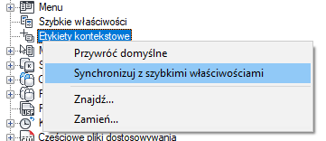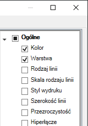 Jeśli właściwość jest zaznaczona, wówczas jest wyświetlana w etykiecie kontekstowej, gdy wskaźnik zostanie umieszczony na obiekcie tego samego typu w oknie rysunku. Należy usunąć znacznik wyboru znajdujący się obok właściwości, aby usunąć właściwość wybranego typu obiektu.