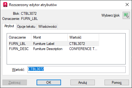 Wartości w sekcji Atrybut służą do sterowania tekstem wyświetlanym na rysunku oraz wartością przypisaną do atrybutu.