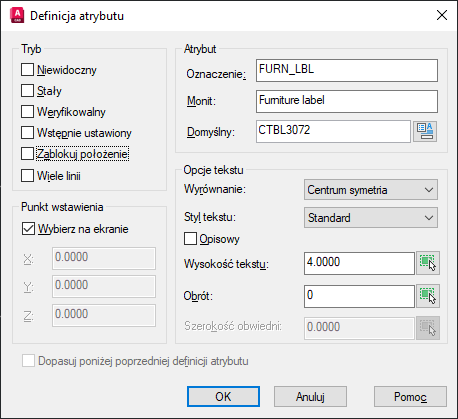 - Oznaczenie — widoczny tekst obiektu zastępczego wyświetlany w oknie rysunku przed dodaniem atrybutu do bloku. Podana wartość służy do identyfikacji atrybutu podczas wyodrębniania wartości z bloku.