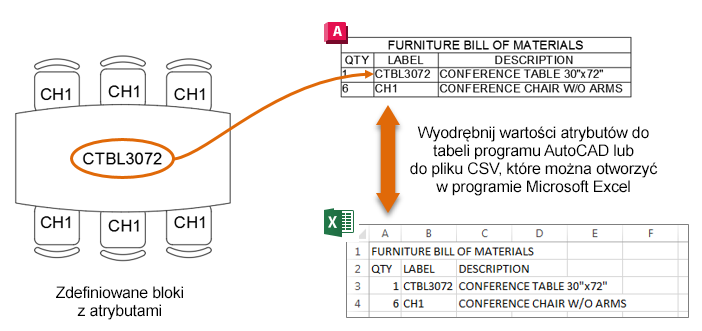 Bloki mogą zawierać specjalne obiekty o nazwie definicje atrybutów zwane również atrybutami bloku. Atrybuty można dodawać do bloku w celu przechowywania wartości, takich jak numery części, nazwy produktów, wartości znamionowe, opisy, koszty elementów itp. Niektóre atrybuty bloku mogą zawierać informacje statyczne, takie jak numer części, podczas gdy inne mogą zawierać informacje różne dla różnych bloków, takie jak ich wykończenie, koszt lub położenie. Wszystkie wartości atrybutów bloku można później wyodrębnić do obiektu tabeli lub pliku CSV, które można zaimportować w innej aplikacji.