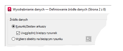 - Wybierz opcje Rysunki/Zestaw arkuszy oraz Uwzględnij bieżący rysunek, a następnie kliknij przycisk Dalej, aby kontynuować.