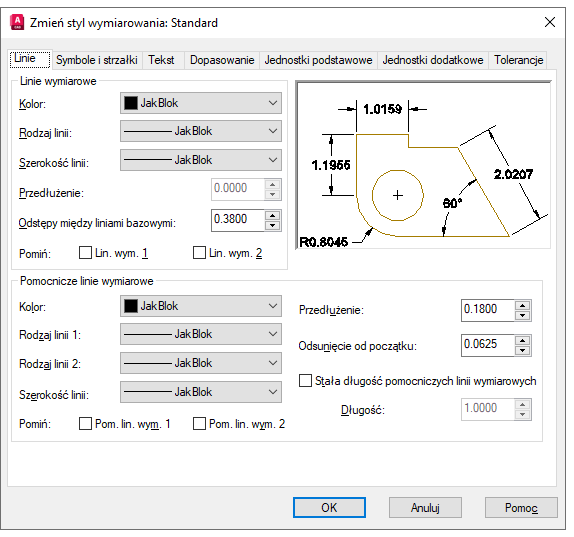 Domyślny styl wymiaru nosi nazwę Standardowy (jednostki calowe) lub ISO-25 (metryczne). Jest on przypisywany do wszystkich wymiarów do momentu ustawienia innego stylu jako bieżącego stylu wymiarowania.