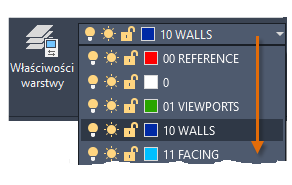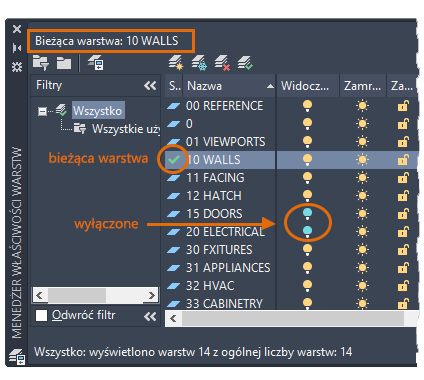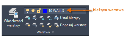 Jak widać na ilustracji, warstwa 10 WALLS jest warstwą bieżącą. Wszystkie nowe obiekty są automatycznie umieszczane na tej warstwie. Na liście warstw zielone pole wyboru obok warstwy 10 ŚCIANY potwierdza, że jest to warstwa bieżąca.