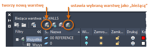 Aby utworzyć nową warstwę, kliknij pokazany przycisk i podaj jej nazwę. Aby ustawić inną warstwę jako bieżącą, kliknij ją, a następnie kliknij wskazany przycisk.